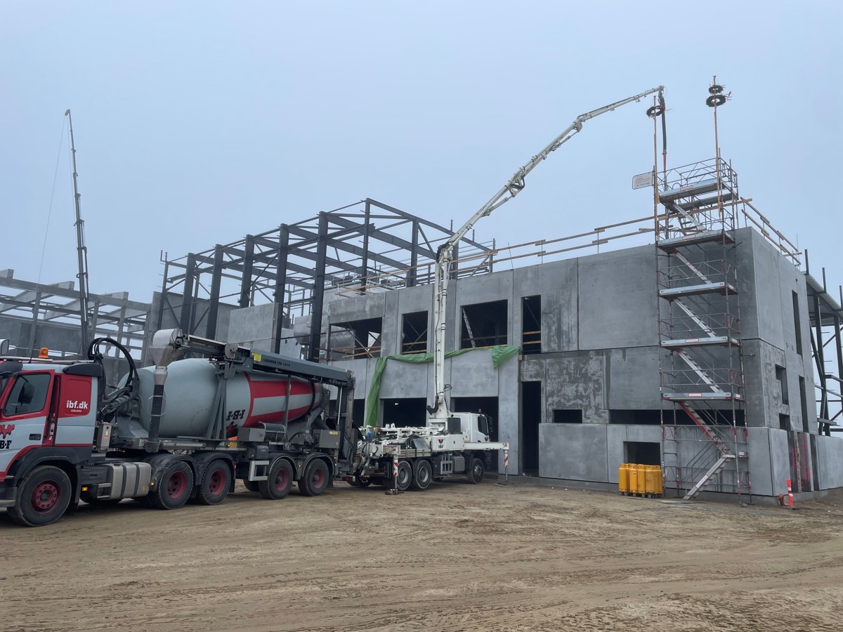 Siden nytår er det lykkedes at rejse spær og meget af væggene til vores nye flisværk. Samtidig har maskinleverandøren skullet bakse alle de største komponenter på plads, så der har været brug for samarbejde og fleksibilitet håndværkerne imellem.